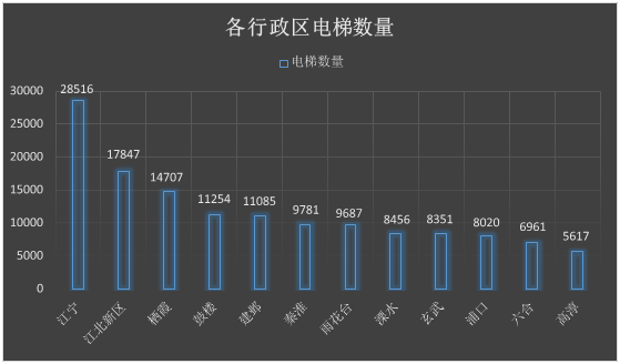抖阴 12个行政区在用电梯分布情况如下,其中江宁区电梯数量最多28516台;高淳区电梯数量最少5617台。