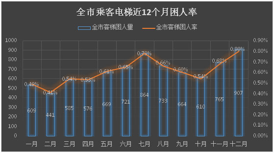 12月份,抖阴 电梯应急处置中心共接处电话3821通,应急处置电梯困人故障951起,解救被困人员1875人,其中涉及乘客电梯困人907起。救援人员到达现场平均用时9.7分钟,现场实施救援平均用时5.1分钟。
