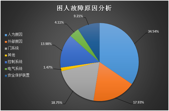 依据《电梯应急处置平台技术规范》(CPASE M001—2019),在人为原因、外部原因、门系统、曳引系统、导向系统、轿厢、控制系统、电气系统、安全保护装置九类故障中:人为原因故障(210起,占34.54%)、门系统故障(1145起,占18.75%)、外部原因故障(109起,占17.93%)居前三位,其中生活(装修)垃圾导致开关门受阻困人161起、停电困人57起、门锁失效77起。