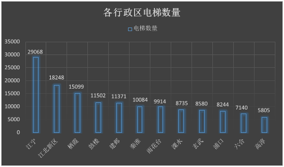 抖阴 12个行政区在用电梯分布情况如下,其中江宁区电梯数量最多29068台;高淳区电梯数量最少5805台。