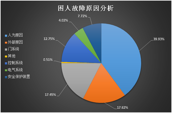 依据《电梯应急处置平台技术规范》(CPASE M001—2019),在人为原因、外部原因、门系统、曳引系统、导向系统、轿厢、控制系统、电气系统、安全保护装置九类故障中:人为原因故障(238起,占39.93%)、外部原因故障(105起,占17.62%)、门系统故障(104起,占17.45%)居前三位,其中生活(装修)垃圾导致开关门受阻困人201起、停电困人53起、门锁失效82起。