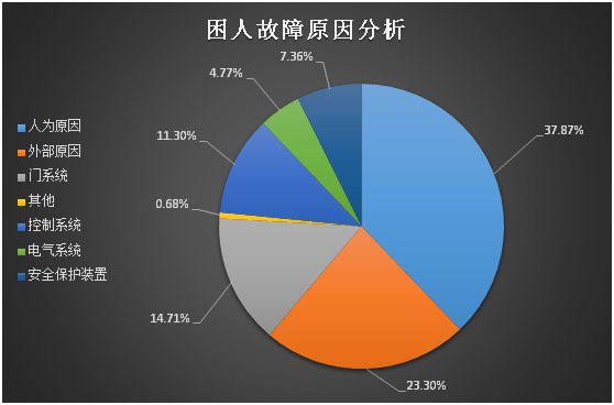 依据《电梯应急处置平台技术规范》(CPASE M001—2019),在人为原因、外部原因、门系统、曳引系统、导向系统、轿厢、控制系统、电气系统、安全保护装置九类故障中:人为原因故障(278起,占37.87%)、外部原因故障(171起,占23.30%)、门系统故障(108起,占14.71%)居前三位,其中生活(装修)垃圾导致开关门受阻困人244起、停电困人70起、门锁失效68起。