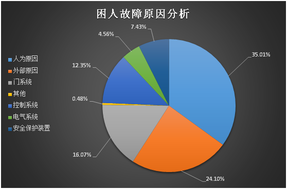 依据《电梯应急处置平台技术规范》(CPASE M001—2019),在人为原因、外部原因、门系统、曳引系统、导向系统、轿厢、控制系统、电气系统、安全保护装置九类故障中:人为原因故障(292起,占35.01%)、外部原因故障(201起,占24.10%)、门系统故障(134起,占16.07%)居前三位,其中生活(装修)垃圾导致开关门受阻困人244起、停电困人76起、门锁失效89起。