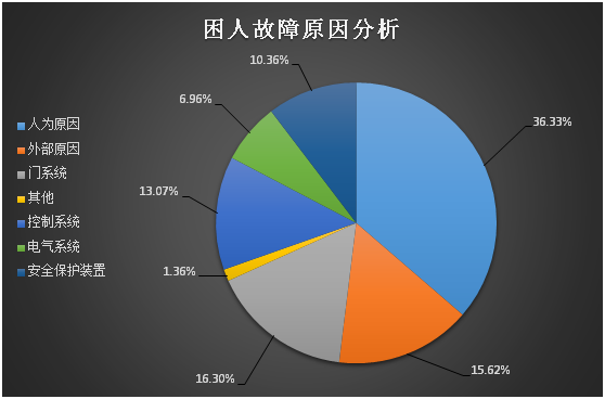 依据《电梯应急处置平台技术规范》(CPASE M001—2019),在人为原因、外部原因、门系统、曳引系统、导向系统、轿厢、控制系统、电气系统、安全保护装置九类故障中:人为原因故障(214起,占36.33%)、门系统故障(96起,占16.30%)、外部原因故障(92起,占15.62%)居前三位,其中生活(装修)垃圾导致开关门受阻困人192起、停电困人40起、门锁失效57起。