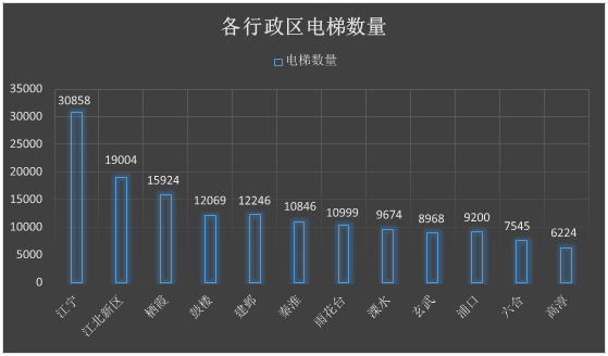 抖阴 12个行政区在用电梯分布情况如下,其中江宁区电梯数量最多30858台;高淳区电梯数量最少6224台。